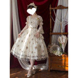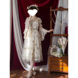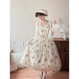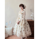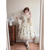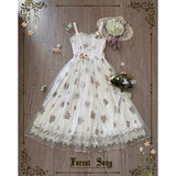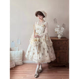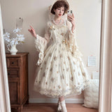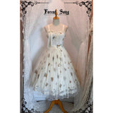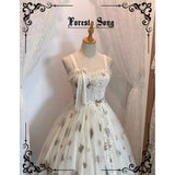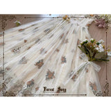 繊細なチュールと野花の刺繍で彩られたクラシカルなジャンパースカート。柔らかな生成り色を基調とし、全体に小花の刺繍が散りばめられていて、まるで野花の歌を紡ぐような優美さを感じさせます。胸元には立体的なレースモチーフと細リボンが添えられ、儚くも華やかな雰囲気を演出。スカートの裾には花と葉をかたどった刺繍レースが重なり、揺れるたびに軽やかな透け感を見せます。