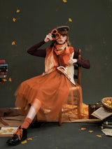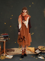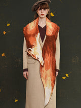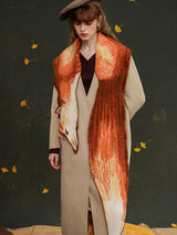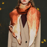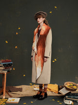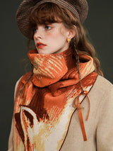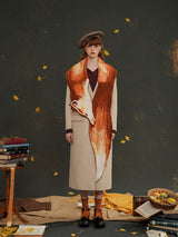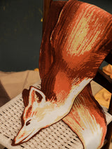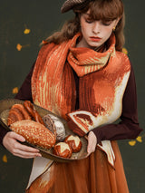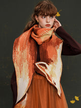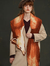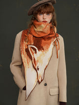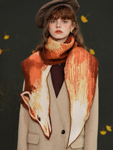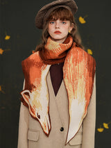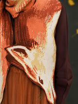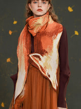 北欧童話の絵本の中に飛び込んだような幻想的な世界。赤狐を油絵で描いた手描きのロングマフラー。なにかを捉えたような鋭さと愛嬌のある目と、西陽に染められたような美しい毛並みに魅了される。軽く纏うだけで存在感たっぷり。