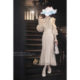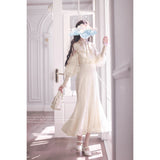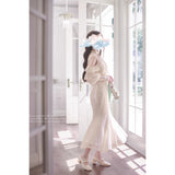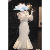 月明かりに溶け込むような柔らかさを纏ったリボンブラウスとマーメイドスカート。ブラウスは繊細なフリルを重ね、肩を優しく覗かせるカッティングがロマンティックな余韻を残します。存在感のあるリボンタイが胸元を飾り、気品の中に可憐さを添えるデザイン。スカートはレースの織りなす柔らかな陰影が美しく、裾に向かってふんわりと広がるマーメイドラインが気品を漂わせます。まるで陽だまりの中に咲く白い花のように、儚くも清楚な美しさを湛えた一着。