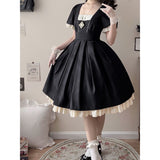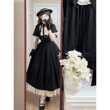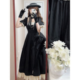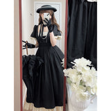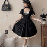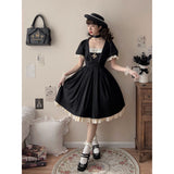 西洋の貴婦人のような、優雅でクラシカルなワンピース。ブラックを基調に、ふんわりと広がるスカートと、クリーム色のフリルが覗く二重仕立ての裾が上品なアクセントとなっています。パフスリーブの袖口にもクリーム色のフリルをあしらっています。しっかりとウエストマークされたデザインで、シルエットはくびれが美しく強調され、大人びたエレガントさを感じさせます。
