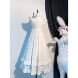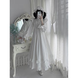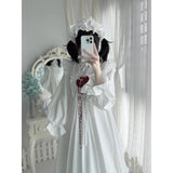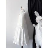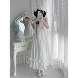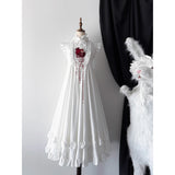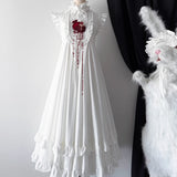 神秘的な物語性を帯びたロングワンピース。清楚な印象の白を基調に、ふんわりと広がるAラインシルエットと段フリルの裾が繊細な少女らしさを引き立てています。アクセサリーを合わせると、まるで“心臓”や“流れる血”を連想させるような強い象徴性を感じさせます。無垢と毒、純粋さと狂気が共存するような、幻想的で詩的な印象を与えるアイテム。