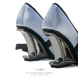 バレリーナのDemi Pointe(ドゥミ・ポアント)から着想を得たハイヒールパンプス。艶めきのあるサテンと、足首に巻きつけるリボンがエレガントな雰囲気を放っています。独創性が奏でる一瞬の美。美しさという圧倒的な存在感をあなたに。
