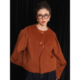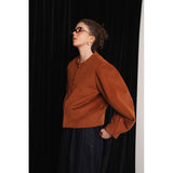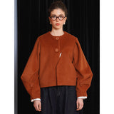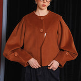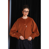 アシンメトリーなデザインのフロントクロージャーが特徴的なジャケット。フロントのボタンは大きめでアクセントとなり、袖口には同じくボタンが施されており、丸みを帯びたシルエットが柔らかな印象を与えます。クラシックなディテールとモダンなアプローチを組み合わせたアイテム。