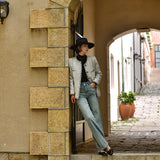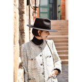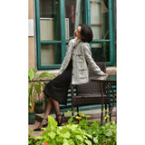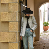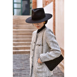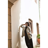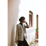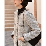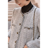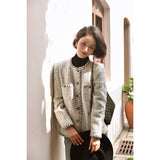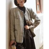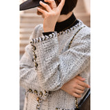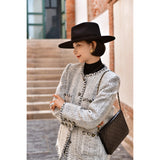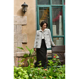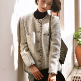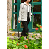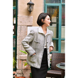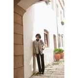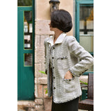 1980年代を彷彿とさせるクラシカルなツイードジャケット。肩を張り出したデザインで、艶めく黒と輝きのある金色のボタン装飾と編み模様がエレガントな雰囲気を演出してくれる。気品溢れる優雅な貴婦人に。