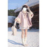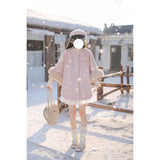 雪の国の妖精が纏うような、淡い夢色のケープコート。やわらかなピンクに包まれたシルエットは、首元と袖を飾るファーがふんわりと温もりを添えています。首元のリボンタイと繊細なブローチが、少女らしい純潔と優雅さを引き立て、まるで白い息とともに甘い魔法が舞い降りるよう。凍てつく空気の中でも心まであたためてくれる、ロマンティックなコート。