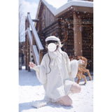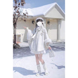 純白の雪に溶け込むような可憐さを纏ったケープコート。ふわりと広がるシルエットに、首元と袖口のファーが柔らかな温もりを添え、まるで雪の精が舞い降りたかのような幻想的な佇まいを描きます。首元のリボンタイと繊細なブローチが儚いきらめきを放ち、冬の光を優しく映すその姿は、静寂の中に咲く白い花のよう。清楚で夢見るような冬の少女にぴったりの、ロマンティックなコート。