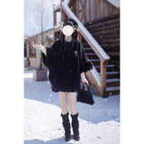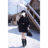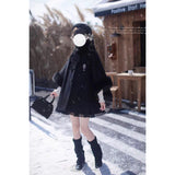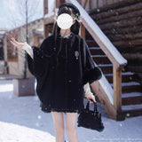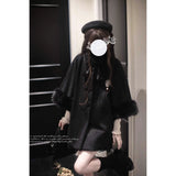 闇夜に咲く黒薔薇のように気品と神秘を纏うケープコート。深いブラックの生地が静かに光を吸い込み、袖口のファーが優雅な陰影を描き出します。首元のリボンタイと胸元のブローチがクラシカルなアクセントとなり、モノトーンの世界に上品な物語を添えるデザイン。冷たい冬の空気の中で、凛として美しく佇む淑女のための、エレガントで退廃的なロマンを感じさせる一着。