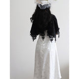 輝かしい光の中の蛾蝶の舞踏。花から花へと巡る蛾蝶を描いたジャンパースカートとショール。優美な雰囲気を醸し出すジャガードアイテムで、裾部分には繊細な花柄のスカラップレースが装飾されています。