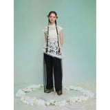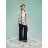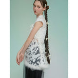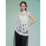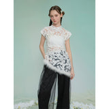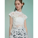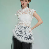 透け感のある花のレースが上品な印象を与えるチャイナトップス。立ち襟やチャイナボタンなど、伝統的なディテールを取り入れつつ、ボディラインにフィットする現代的なシルエットにアレンジされています。レースの透け感が軽やかさを演出してくれる。裾部分には、フェイクファーがあしらわれ、華やかさと遊び心をプラスしています。