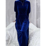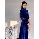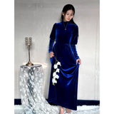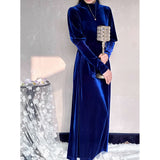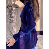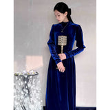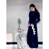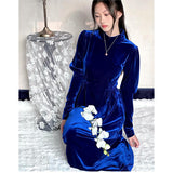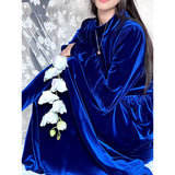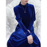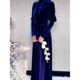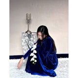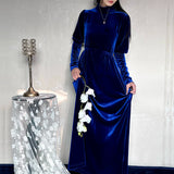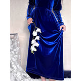 聖なる宝石と呼ばれる"瑠璃"みたいな色合いのベルベットワンピース。肩部分に膨らみを持たせたデザインで、シンプルながらも洗練されたシルエットが魅力。ベルベットの光沢が上品で、柔らかく流れるラインが女性らしさを引き立ててくれる。鮮やかさのある幻想的な瑠璃色に胸の鼓動が高鳴ります。