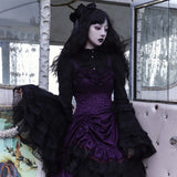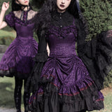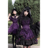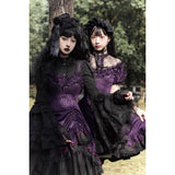 優雅で華やかな貴族のお嬢様に。繊細なジャカード生地とレース装飾が美しいクラシカルなワンピースと、たっぷりのフリルとレースが施されたジャンパースカート。ワンピースは、胸元のフリルとボタン、ドレープ状に絞られたスカート部分が優雅な立体感を演出しており、甘さと気品を併せ持っています。ジャンパースカートは、ブラウスとの重ね着によって、袖元のボリュームフリルとレースの繊細さが加わり、よりロマンティックな印象に仕上がります。