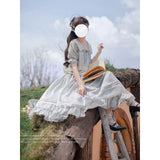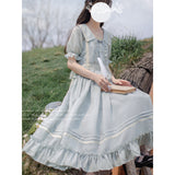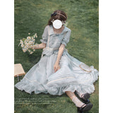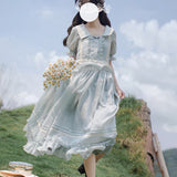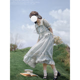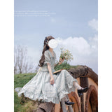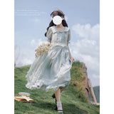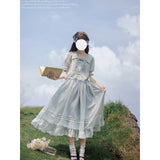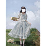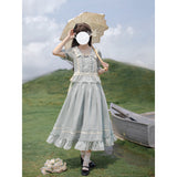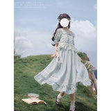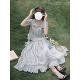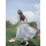 湖面を映した爽やかな空のような色合いのブラウスとロングスカート。ブラウスは胸元にフリルが装飾されており、ウエスト部分にリボンが装飾されています。スカートは裾部分にフリルとプリーツが装飾されており、優雅に膨らむ圧倒的な存在感に魅了される。