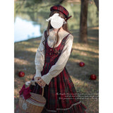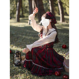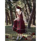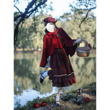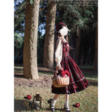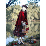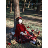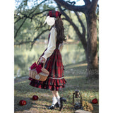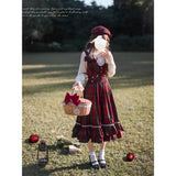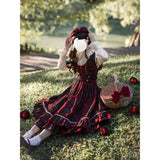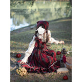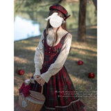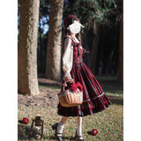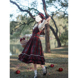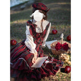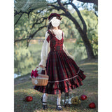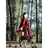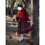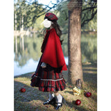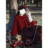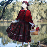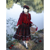 童話物語の世界に迷い込んだみたい。ブリティッシュレトロな雰囲気たっぷりのチェック柄のジャンパースカートと、プリーツの装飾が印象的なブラウスと、真っ赤なケープ。ジャンパースカートの広がる優雅なシルエットが美しく、ゆったりとした大きめのケープに目を奪われる。絵本の中の空想的な物語の世界へと誘われてみて。