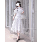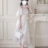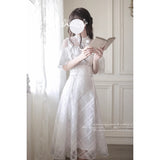 まるで小説に登場する令嬢のような、凛とした清楚さを醸し出しているアイテム。繊細なシースルーレースとフリルをあしらったケープトップスは、クラシカルで優美な印象を与え、首元のリボンが気品を添えています。スカートは光沢のある格子柄のオーガンジー素材が重なり、歩くたびにふわりと広がる優美なシルエットを描きます。ウエストにはコルセットを施したようなレースアップが施され、シルエットにメリハリをもたらしつつ、ロマンティックなムードを強調しています。