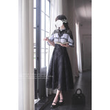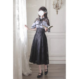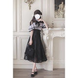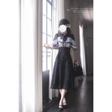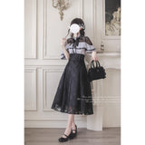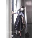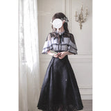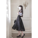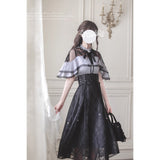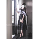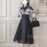 物語の中の令嬢のような、優雅で知的な雰囲気を醸し出しているアイテム。繊細なシースルーレースとフリルをあしらったケープトップスは、クラシカルで優美な印象を与え、首元のリボンが気品を添えています。スカートは光沢のある格子柄のオーガンジー素材が重なり、歩くたびにふわりと広がる優美なシルエットを描きます。ウエストにはコルセットを施したようなレースアップが施され、シルエットにメリハリをもたらしつつ、ロマンティックなムードを強調しています。