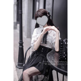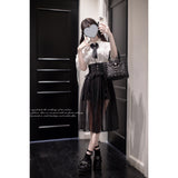 夜に咲き、影をまとうお嬢様に。トップスは、繊細なレースとフリルが贅沢にあしらわれたアイテム。大きなラッフルケープ風のフリルが肩を包み、クラシカルな気品を漂わせます。胸元には黒のリボンタイとブローチ風のアクセントが添えられ、甘さと引き締めのバランスが絶妙です。スカートは、ウエストを引き締めるコルセットを組み合わせたデザインのブラックのレイヤードスカート。上からは透け感のあるチュールスカートが重ねられ、動くたびに揺れる軽やかなシルエットが魅力。