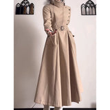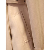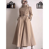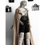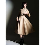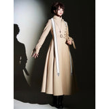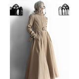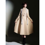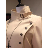 クラシカルなトレンチの要素を受け継ぎながら、モード的なシルエットとディテールで昇華されたロングコート。高めのスタンドカラーとバックル付きのベルトが軍服のような端正さを与え、アシンメトリーに並ぶボタンがシャープな印象を強調しています。ロング丈のフレアシルエットによって動きに優雅さを生み、クラシックとエッジが融合した雰囲気を放ちます。重厚で気品のあるクラシック・ミリタリーテイストを基盤に、現代的なモード感と舞台衣装のような存在感を兼ね備えたドラマティックなロングコート。