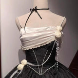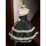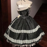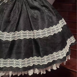 19世紀の舞踏会を彷彿とさせるような優雅でロマンティックなキャミソールワンピース。深みのあるブラック地には繊細な地模様が織り込まれ、胸元にはしなやかな光沢を放つオフホワイトのドレープが掛けられています。スカート部分にはクラシックなレースが段状にあしらわれ、ボリュームのあるシルエットが広がります。現代的な気品も漂わせる、エレガントなアイテム。