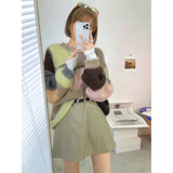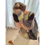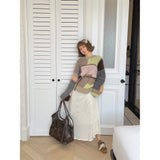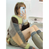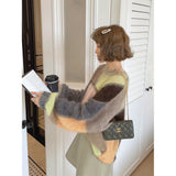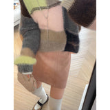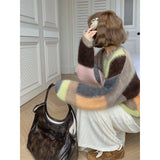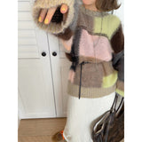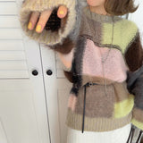 ふんわりとしたカラーブロックデザインのモヘアニットセーター。ピンク、ブラウン、イエロー、グレーといったソフトで落ち着いた色合いが組み合わされており、温かみと遊び心が感じられるデザイン。ゆったりとしたシルエットで、カジュアルな雰囲気があります。