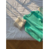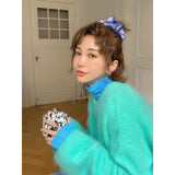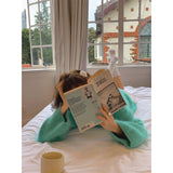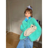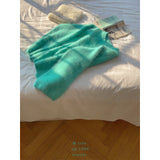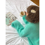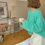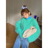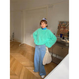 鮮やかなターコイズカラーのふんわりとしたニットセーター。ゆったりとしたオーバーサイズのデザインで、リラクシーな雰囲気を演出。袖口も少し広がっており、ふんわりとした質感が引き立つディテールになっています。コーディネート全体にポップで明るいアクセントを加えています。カジュアルでありながらも洗練された印象を与えます。