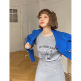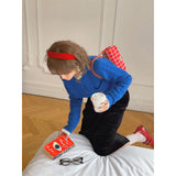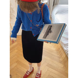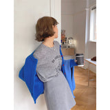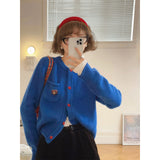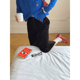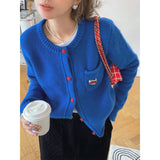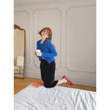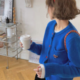 ビビッドなブルーと赤いアクセントが特徴的なポップでレトロなニットカーディガン。赤いボタンがアクセントとなり、ブルーとのコントラストがポップでレトロな印象を与えています。首まわりや袖口、裾部分はリブ編みとなっており、全体をきれいにまとめています。ポップなカラーとディテールで遊び心がありながらも、シンプルに着こなせるアイテム。