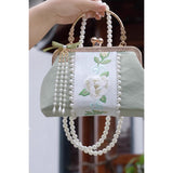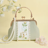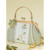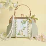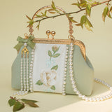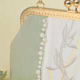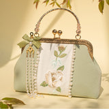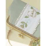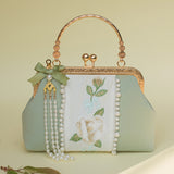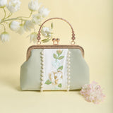 幾重にも重なり、ふわふわと広がる芍薬の花。その芳香で周囲を魅了する花の貴族を刺繍したがま口バッグ。ロマンティックでアンティーク調な雰囲気が漂います。ゴールドのがま口金具とチェーンハンドルが、上品な輝きを添えています。華やかさと儚さを堪能してみて。