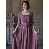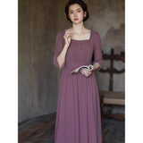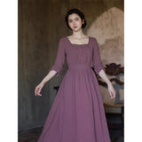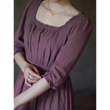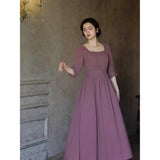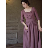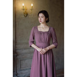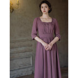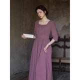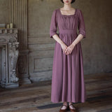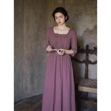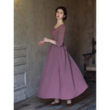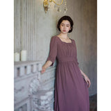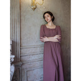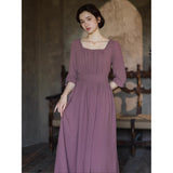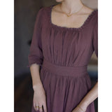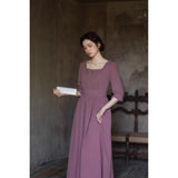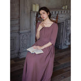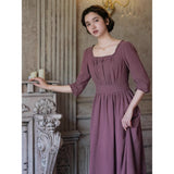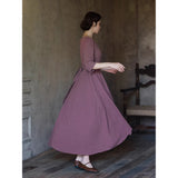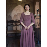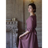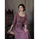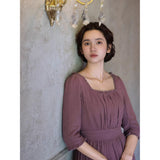 記憶の中にそっと残る午後のひとときのように、静謐な美しさを纏ったワンピース。くすんだローズカラーの生地は、年月を経て少し色褪せた花びらやアンティークの布地のような深みを帯び、落ち着いた空気の中にほんのりとした温もりを宿しています。細やかなギャザーと柔らかく広がるシルエットは、ゆったりと流れる時間と心の余白を表現し、控えめな装飾は、華美ではなく内に秘めた優雅さを静かに語りかけます。