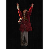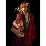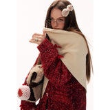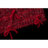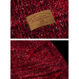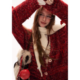 深みのある赤を基調に、複数の糸色が溶け合うように編み込まれたカーディガン。ざっくりとしたローゲージの編み地は空気を含み、羽織った瞬間に柔らかな重みと安心感を与えます。ところどころに結ばれた小さなリボンが、甘やかさのある独特の佇まいを生み出しています。