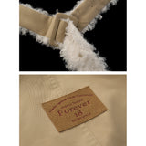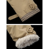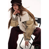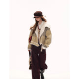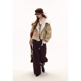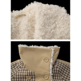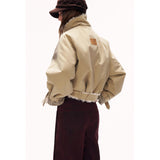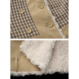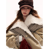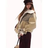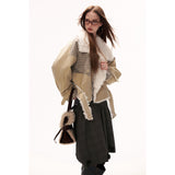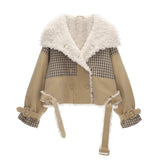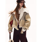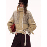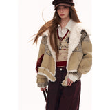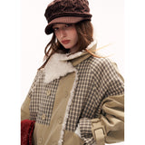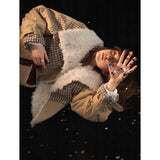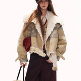 やわらかなベージュトーンを基調に、身頃には細かなチェック柄、袖や切り替えにはマットな無地素材を配したパッチワークのような構成が印象的なジャケット。ふんわりとした白いボアが大きく襟元から前立て、裾にかけて縁取られることで、まるで冬の光をそのまままとったかのような温もりを感じさせます。袖や裾部分にはベルトが施されており、無骨さと装飾性を同時に与えています。