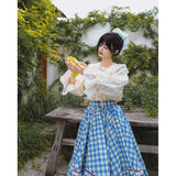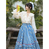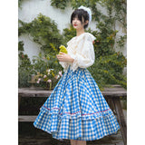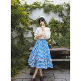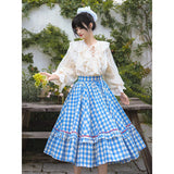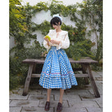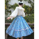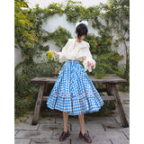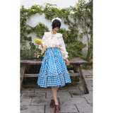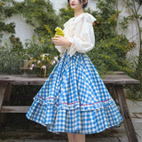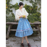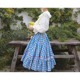 晴れ渡った紺碧の空のような鮮やかなブルーのギンガムチェック柄のフレアスカート。連なる小さな小花柄はレトロな雰囲気を醸し出しています。裾部分には二重のフリルが可憐さを演出しています。歩くたびに広がる軽やかなシルエットが、レトロでガーリーな雰囲気を引き立ててくれる。