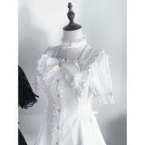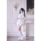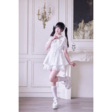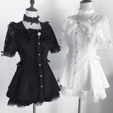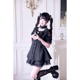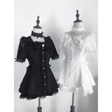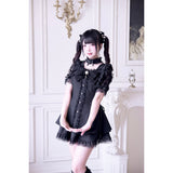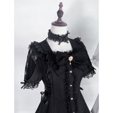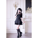 ロマンティックでゴシックな雰囲気を纏ったワンピースとショートスカート。胸元にあしらわれた大きなレースリボンと中央のビジューが印象的で、縦にあしらわれたフリルとボタンがエレガントさを際立たせます。袖やネックラインには繊細なレースが使われ、可憐さと華やかさを両立しています。ワンピースの裾から覗くレース付きのショートスカートは、裾のフリルが足元を華奢に見せ、ゴシックロリータらしい重ね着スタイルを完成させています。