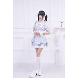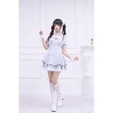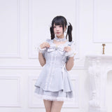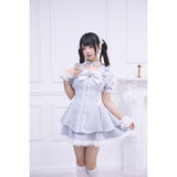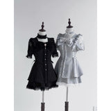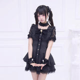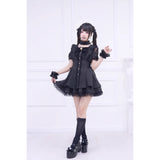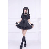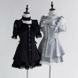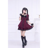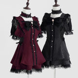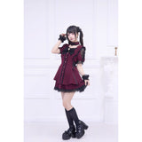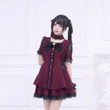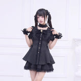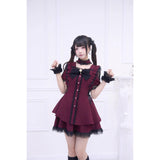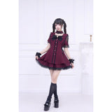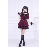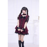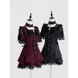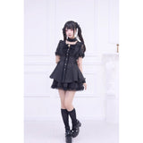 ロマンティックでゴシックな雰囲気を纏ったワンピースとショートスカート。胸元にあしらわれた大きなレースリボンと中央のビジューが印象的で、縦にあしらわれたフリルとボタンがエレガントさを際立たせます。袖やネックラインには繊細なレースが使われ、可憐さと華やかさを両立しています。ワンピースの裾から覗くレース付きのショートスカートは、裾のフリルが足元を華奢に見せ、ゴシックロリータらしい重ね着スタイルを完成させています。