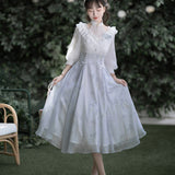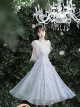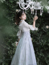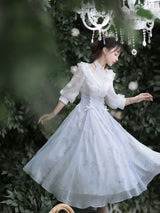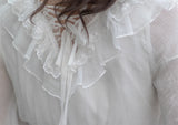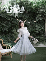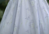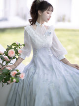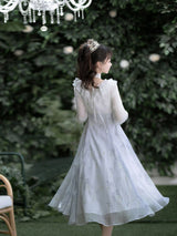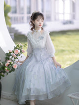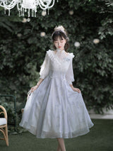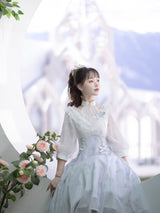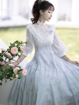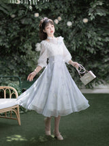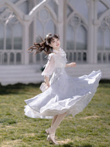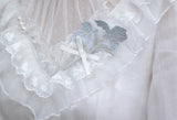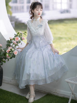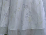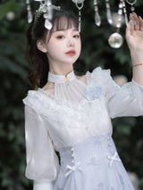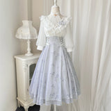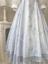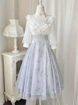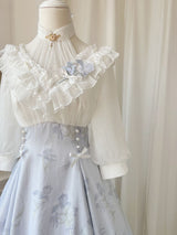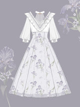 幻想的な紫色の花を咲かせるアイリスの花を描いたエレガントなワンピース。ブラウスとハイウエストなスカートを組み合わせたフェイクツーピースなアイテム。肩から胸元にかけて絢爛にフリルが装飾されています。優雅で気品溢れるお嬢様に。