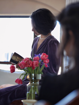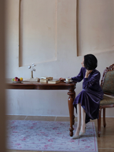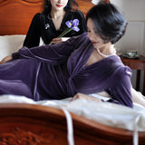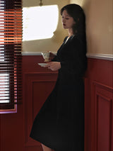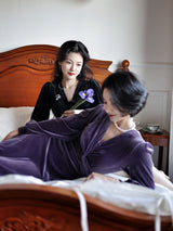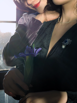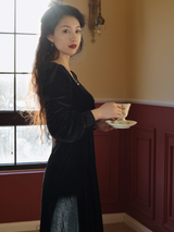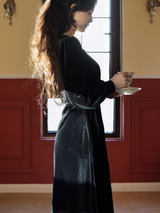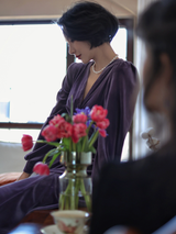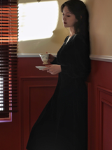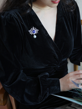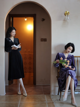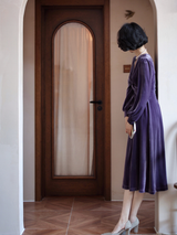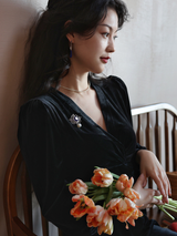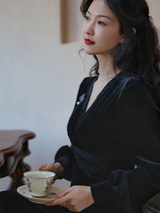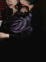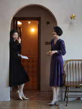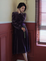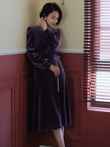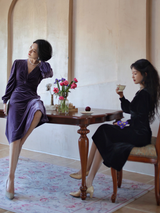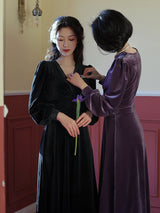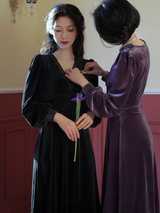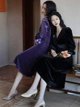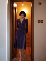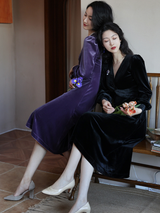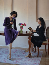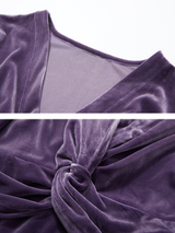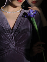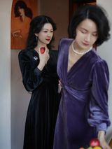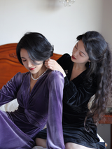 濡れたように艶めくベルベットワンピース。高貴な貴婦人を彩ってくれるエレガントなアイテムです。パープルとブラックの2色展開です。胸元で捻って、クロスさせたようなデザインです。妖艶な美しさを解き放つレトロな淑女スタイルをお楽しみください。