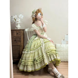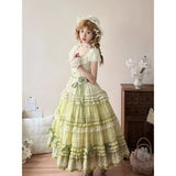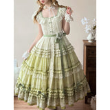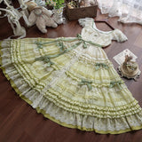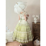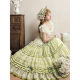 まるで19世紀の貴婦人を思わせるような、優雅でノスタルジックな雰囲気を漂わせるワンピース。淡いグリーンのグラデーションと繊細なレースが特徴的。胸元と袖口にはフリルレースがあしらわれており、可憐でありながら上品な印象を演出。ウエストにはリボンベルトがあしらわれ、全体にあしらわれた細やかなティアードフリルが、立体感と華やかさを添えています。