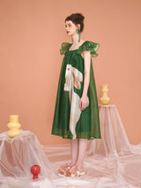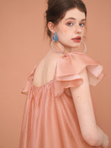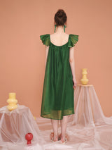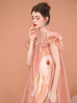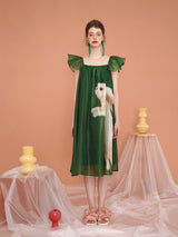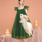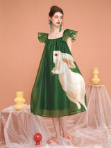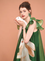 遠くを眺める白兎を大胆に描いたワンピース。煌々と輝く満月でも眺めているのだろうか。艶やかな光沢感とドレープ感が特徴的。夜空の彼方のお月様にいるうさぎ。森の中で平和に暮らすうさぎ。幻想的な童話世界を美しく描いたうさぎを纏ってみて。