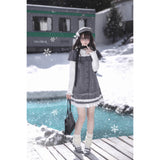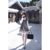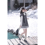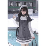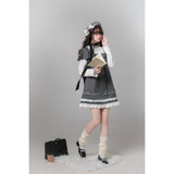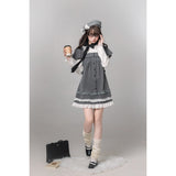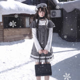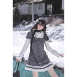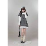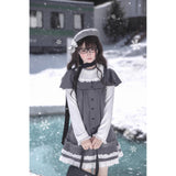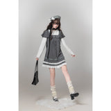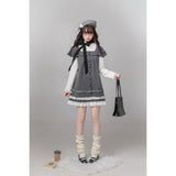 静かな午後にカフェや図書室で本を開く姿が自然と浮かび上がる。アンティーク調の少女らしさが漂うドッキングワンピース。グレーの細かなドット柄ジャンパースカートに、白の長袖インナーをドッキングしたような一着。肩をふんわりと覆うケープ風デザインと、胸元のレースカラーが清楚でクラシカルな雰囲気を醸し出しています。裾には幾重にも重なるレースフリルがあしらわれており、全体を可愛らしくまとめ上げています。
