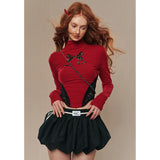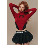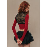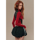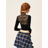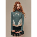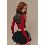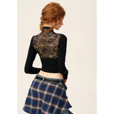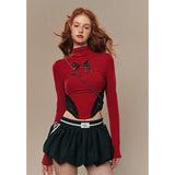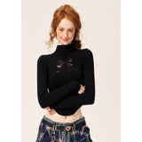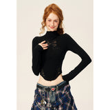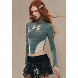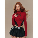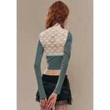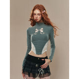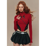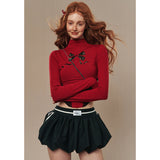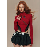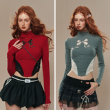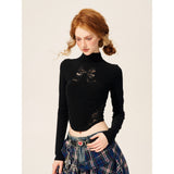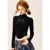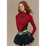 想いを形に変えるリボンを胸元に刺繍したショート丈のタートルネックトップス。バックは透け感のあるレースが大胆に施されています。ウエスト部分がフィットしており、スタイルアップ効果があり、エレガントかつモード感を演出してくれるアイテム。