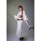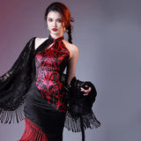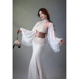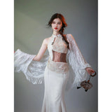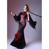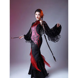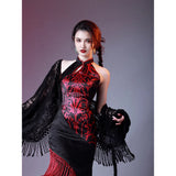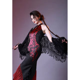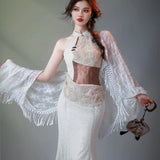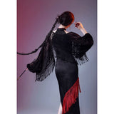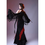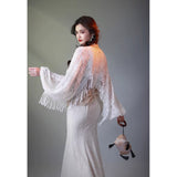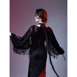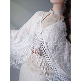 夜の舞台で静かに舞う東洋の踊り子の優雅な所作と、扇のように広がる衣の流れをイメージしたショールカーディガン。透け感のある繊細なレースが大きく広がり、腕を動かすたびに軽やかに揺れる様子は、舞の動きに合わせて空気をまといながら広がる羽衣のようにも感じられます。縁には細やかなフリンジがあしらわれ、動きに合わせて柔らかく揺れ、舞台の照明の中で優雅なリズムを生み出します。