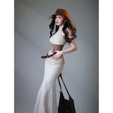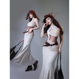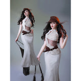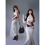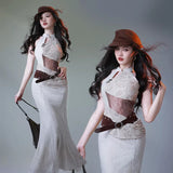 伝統的な東洋の美しさとモダンなスタイルが交差する、洗練されたチャイナワンピース。繊細なレース刺繍が施された淡いアイボリーの生地は、伝統的なチャイナドレスの優雅さを感じさせながらも、身体のラインに沿って美しく流れるマーメイドシルエットによって、洗練された現代的な雰囲気を漂わせています。胸元のホルターネックや透け感のあるウエストのレースは、クラシックな東洋衣装にモダンなファッション性を重ねたような印象を与えます。