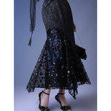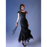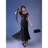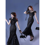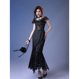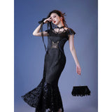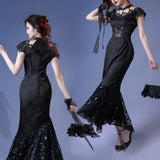 夜の舞踏会に現れるミステリアスな東洋の淑女を彷彿とさせるチャイナワンピース。深い黒のレース生地が身体のラインに沿って優雅に流れ、静かな夜の空気をまとったような落ち着いた気品を漂わせています。胸元には繊細なレースと透け感のあるディテールが重ねられ、チャイナカラーから広がるストラップのラインが首元を美しく縁取り、まるで夜の宝石のように静かに輝くアクセントとなっています。ウエスト部分には曲線を描く装飾ラインと透けるレースが組み合わされ、クラシックなチャイナドレスの優雅さに、コルセットのようなモダンで洗練されたシルエットが重ねられています。裾に向かって広がるマーメイドラインのスカートには細かなスパンコールが散りばめられ、歩くたびに夜空の星のようなきらめきを放ちます。