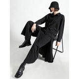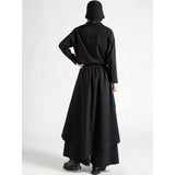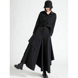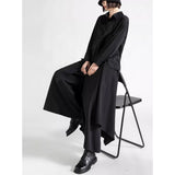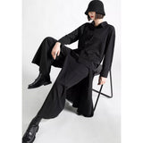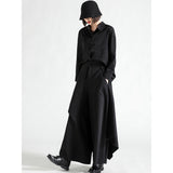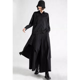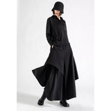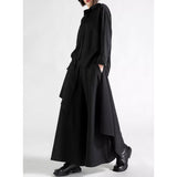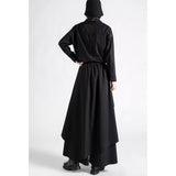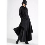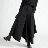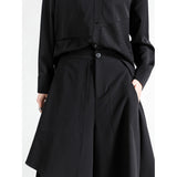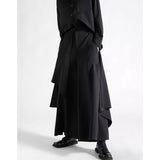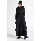 ワイドパンツの上からスカートを被せたようなアシンメトリーなシルエットのパンツスカート。ダークな雰囲気ながらも、ゆったりとしたドレープ感と、洗練された遊び心にあふれたデザイン。圧倒的な存在感を放つ主役級アイテム。
