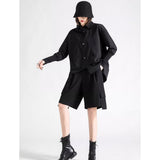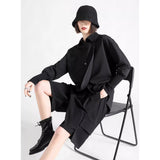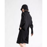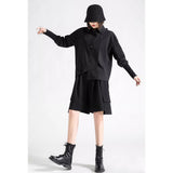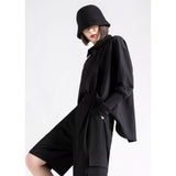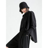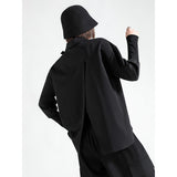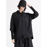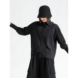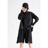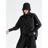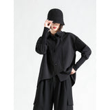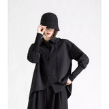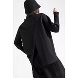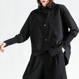 左右非対称なアシンメトリーなデザインが特徴的なブラウス。袖口が長く、伸縮性のあるニット生地となっています。左肩部分にバンドを装飾した遊び心あふれるデザイン。匂い立つ”黒”が存在感が際立たせてくれる。