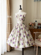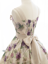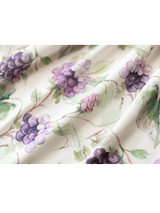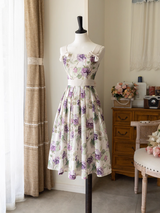 たわわに実った葡萄を水彩で描いたクラシカルなジャンパースカート。まるで大粒の宝石を散りばめたみたい。ウエスト位置が高く、バックにリボンが装飾されています。ふわりと広がるスカート部分がエレガントな雰囲気を演出してくれる。