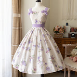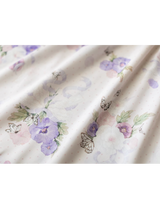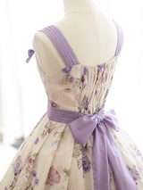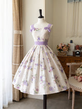 三色菫の花々のまわりを蝶々が舞っている情景を水彩で描いたクラシカルなジャンパースカート。パステルカラーの花びらは幻想的な雰囲気を与えてくれる。ウエスト位置が高く、バックにリボンが装飾されています。ふわりと広がるスカート部分がエレガントな雰囲気を演出してくれる。