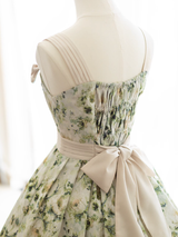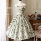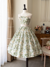 陽光に照らされて輝いている緑の花々を水彩で描いたクラシカルなジャンパースカート。濃すぎるほどの緑。水彩特有の滲み重なった色彩が美しい。ウエスト位置が高く、バックにリボンが装飾されています。ふわりと広がるスカート部分がエレガントな雰囲気を演出してくれる。