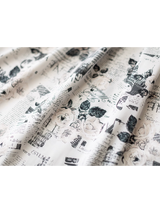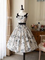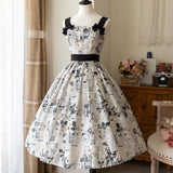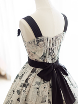 西洋の古新聞に白薔薇を組み合わせたクラシカルなジャンパースカート。モノクロのコラージュデザインはノスタルジックな雰囲気が漂います。ウエスト位置が高く、バックにリボンが装飾されています。ふわりと広がるスカート部分がエレガントな雰囲気を演出してくれる。
