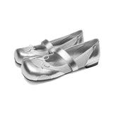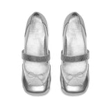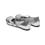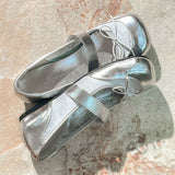 未来的な煌めきを纏ったメタリックシルバーのバレエシューズ。艶やかな質感と、フロントのリボンが愛らしさを添える一足。ロマンティックとモードが融合した、クラシカルで現代的なアイテム。