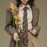 ブリティッシュレトロな雰囲気に演出してくれるストライプ柄のネクタイ。ダークブラウンとダークグリーンの斜線柄は、格調高きレトロな印象を与えてくれる。存在感を放ったカレッジスタイル。