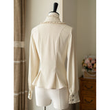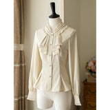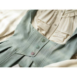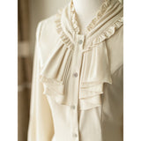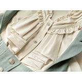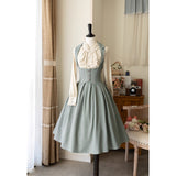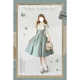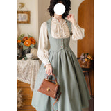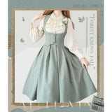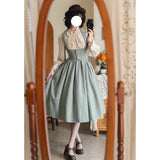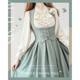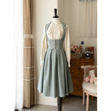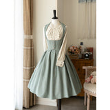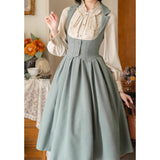 エレガントな英国のお嬢様みたいな雰囲気のジャンパースカートとハイネックなブラウス。ジャンパースカートはベストとスカートを組み合わせたようなデザインで、バックに編み上げが装飾されています。ブラウスはネックラインと袖口にフリルが装飾されており、首元にリボン飾りを装飾したデザイン。時代を超えて輝く永遠のスタイル。